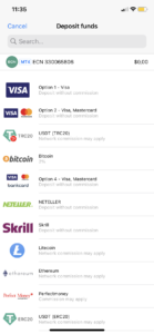 • Visa: Os depósitos são instantâneos e gratuitos. Os saques demoram de 15 a 20 minutos e podem levar de 5 a 7 dias úteis para chegar à sua conta bancária. Os saques são cobrados com uma comissão de 1 USD.